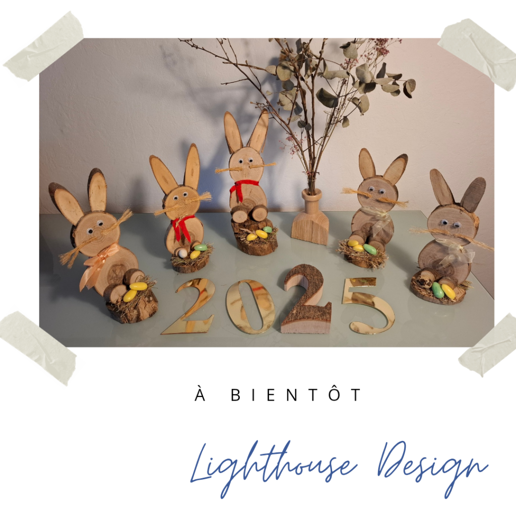 Vous êtes séduit par l’idée d’ajouter nos lapins en bois à votre collection de déco de Pâques ? Nous vous offrons la possibilité de réserver jusqu’à trois lapins par famille. Pour cela, il vous suffit de nous contacter et de manifester votre intérêt. Cela vous assure de bénéficier de ces pièces uniques dès leur sortie. Pour 2026 nous allons lancer une petite série limitée de lapins en bois. Nous ne demandons pas d’acompte il vous suffit de manifester votre intérêt. Vous pouvez NOUS CONTACTER pour de plus amples informations.