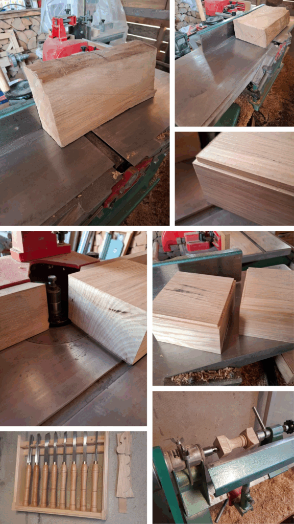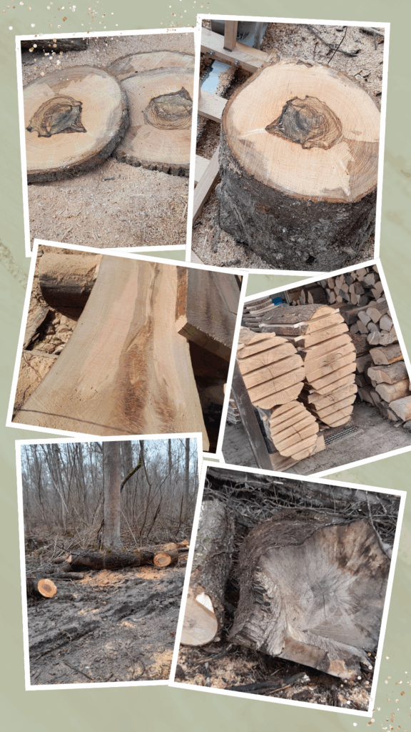 Notre amour pour le bois et la nature guide nos créations. Nous utilisons exclusivement du bois massif, récupéré localement dans un rayon d’environ 40 km autour de notre atelier. Ces bois proviennent d’arbres qui auraient autrement été destinés au bois de chauffage. Nous débitons et séchons nous-mêmes les troncs à l’air libre, garantissant ainsi un processus écologique du début à la fin.