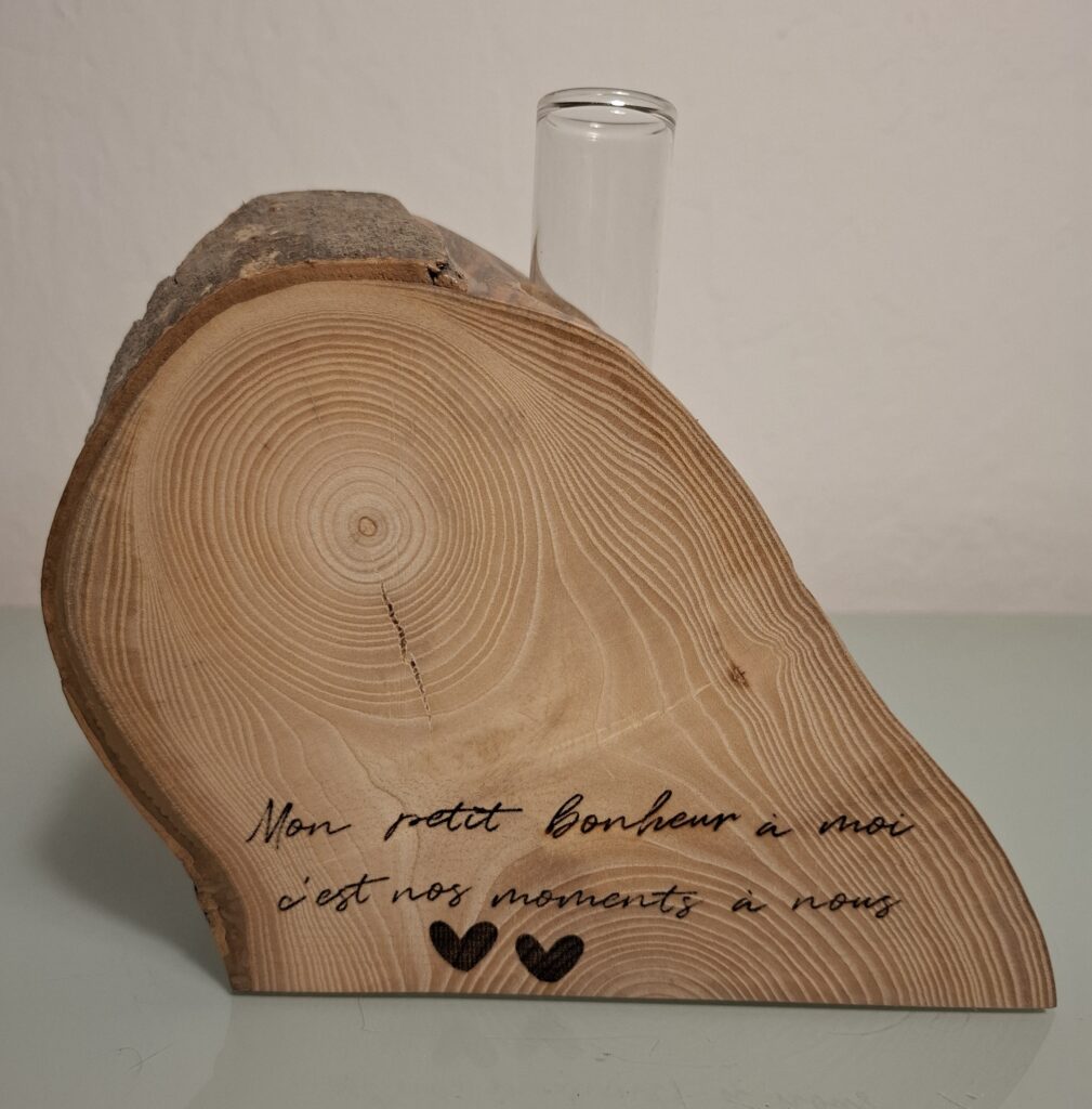 Un soliflore en bois gravé constitue un ajout élégant à toute pièce. Ces vases minimalistes accueillent une seule fleur, mais leur impact visuel est grand. Graver une citation inspirante à la base du soliflore accentue son charme. Nous constatons que les soliflores gravés ont plus de succès. Certains modèles du catalogue sont déjà gravés, cependant il y à possibilité de graver n’importe quel soliflore avec le texte ou dessin de votre choix. Nous vous encourageons à NOUS CONTACTER pour obtenir plus de détails.
