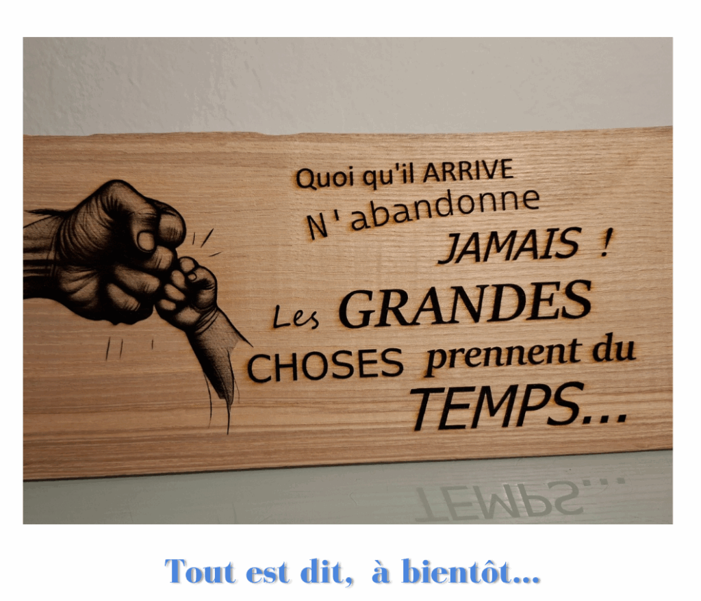 Le bois est un matériau chaleureux et naturel. Graver des phrases positives sur du bois ajoute une ambiance apaisante à votre intérieur. « Le bambou qui plie est plus fort que le chêne qui résiste » ou « Le voyage le plus long commence par un simple pas » sont des exemples inspirants. Ces phrases diffusent de la positivité dans votre maison. Elles s’intègrent parfaitement dans un salon ou une chambre ou même une salle de bains.