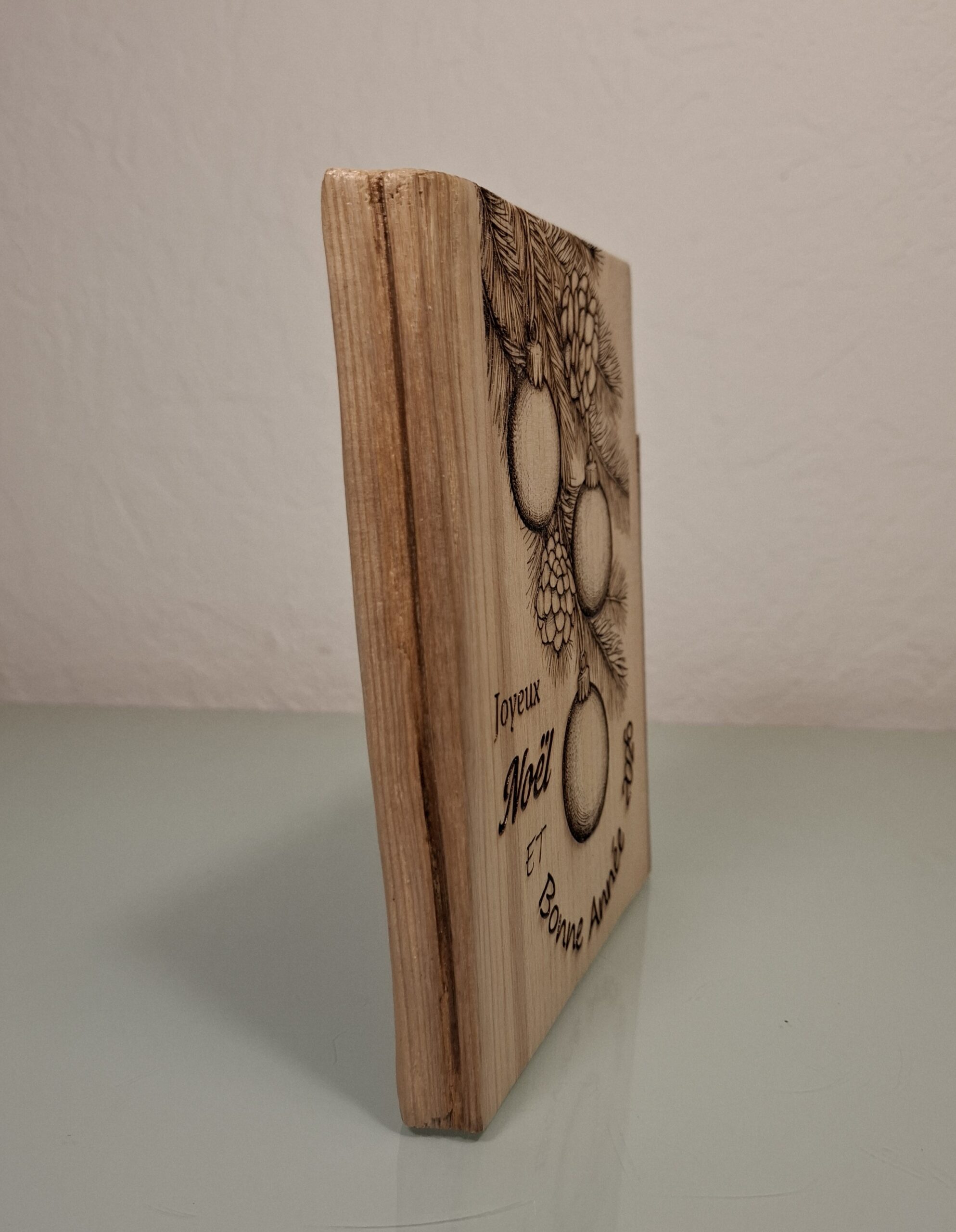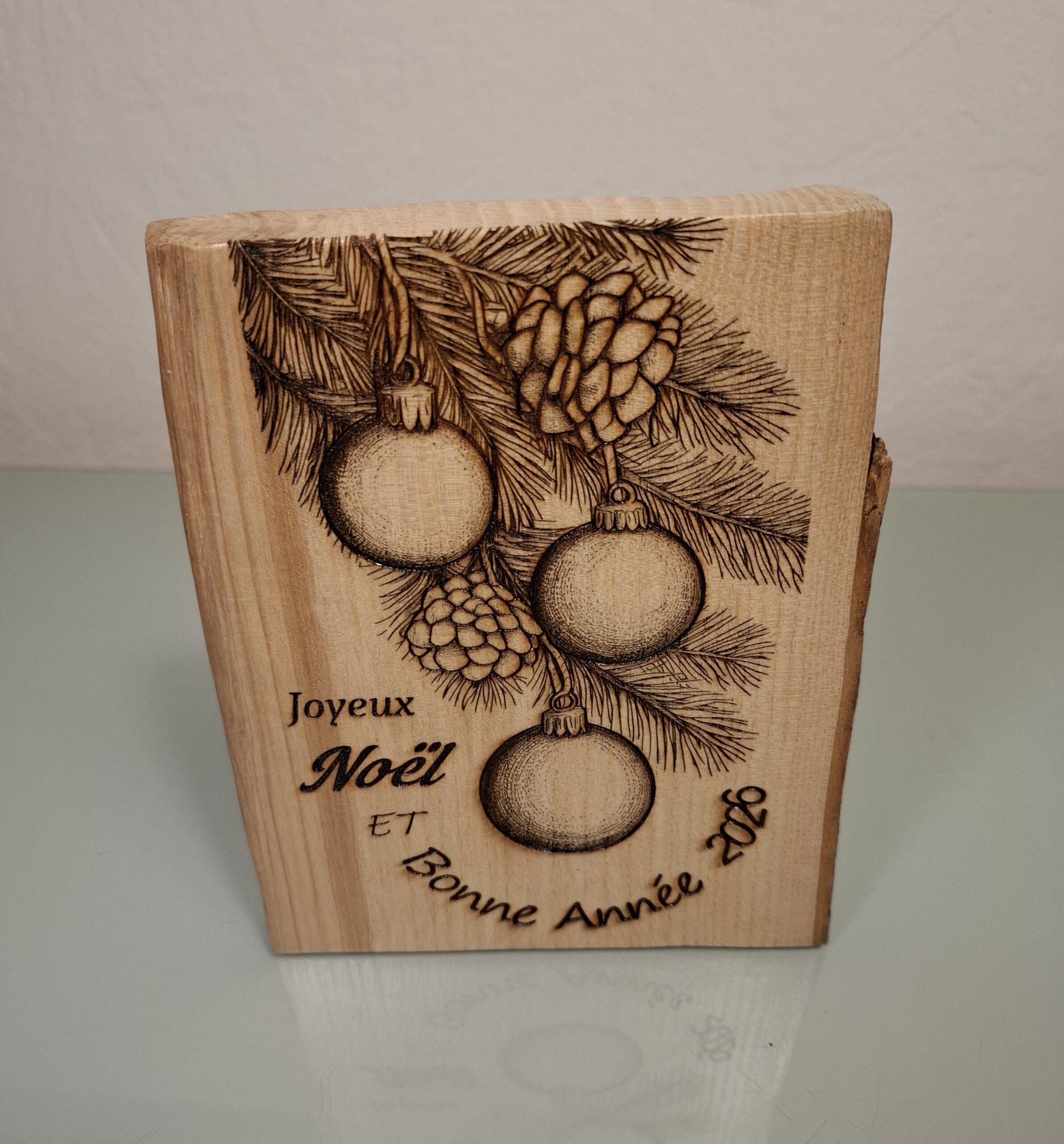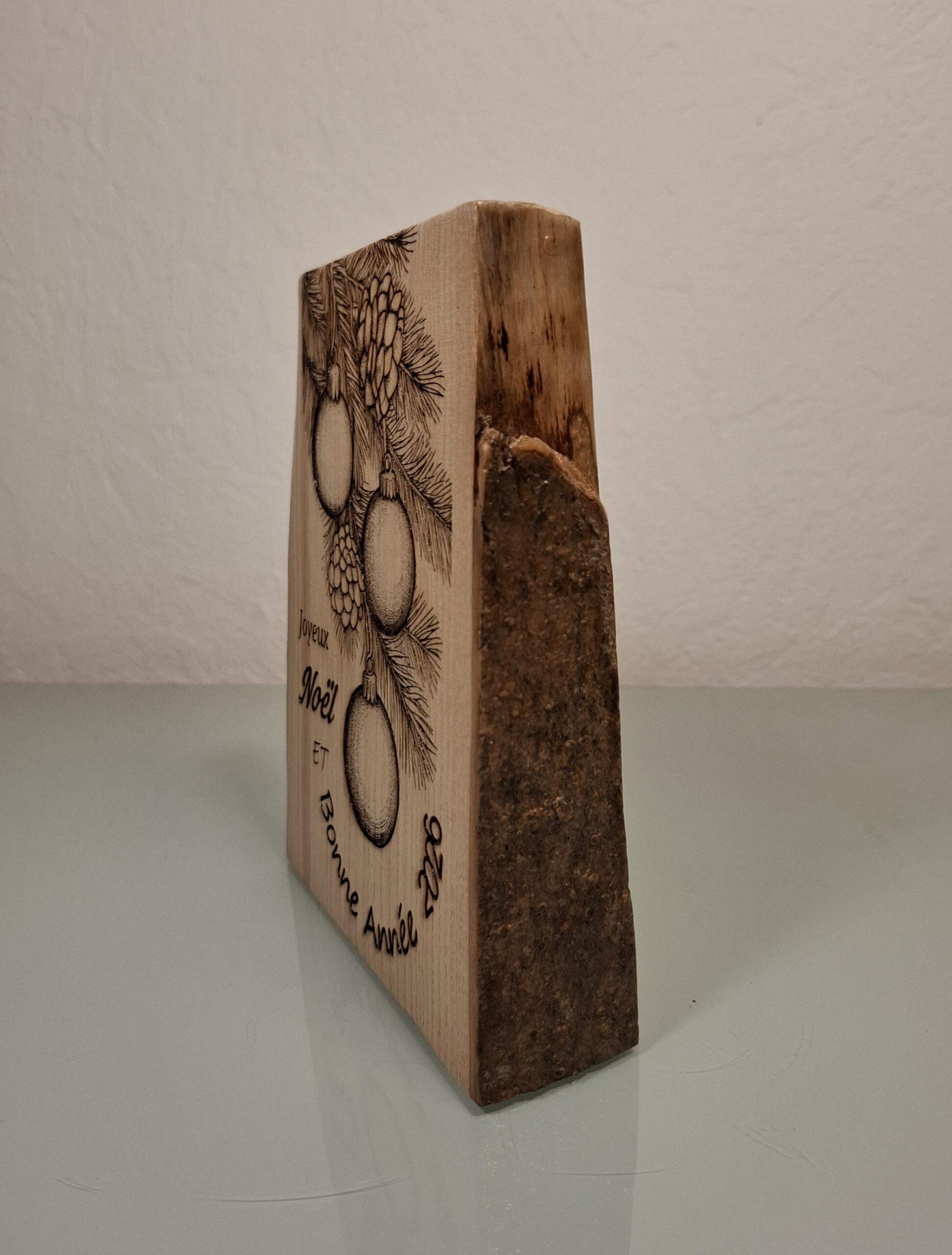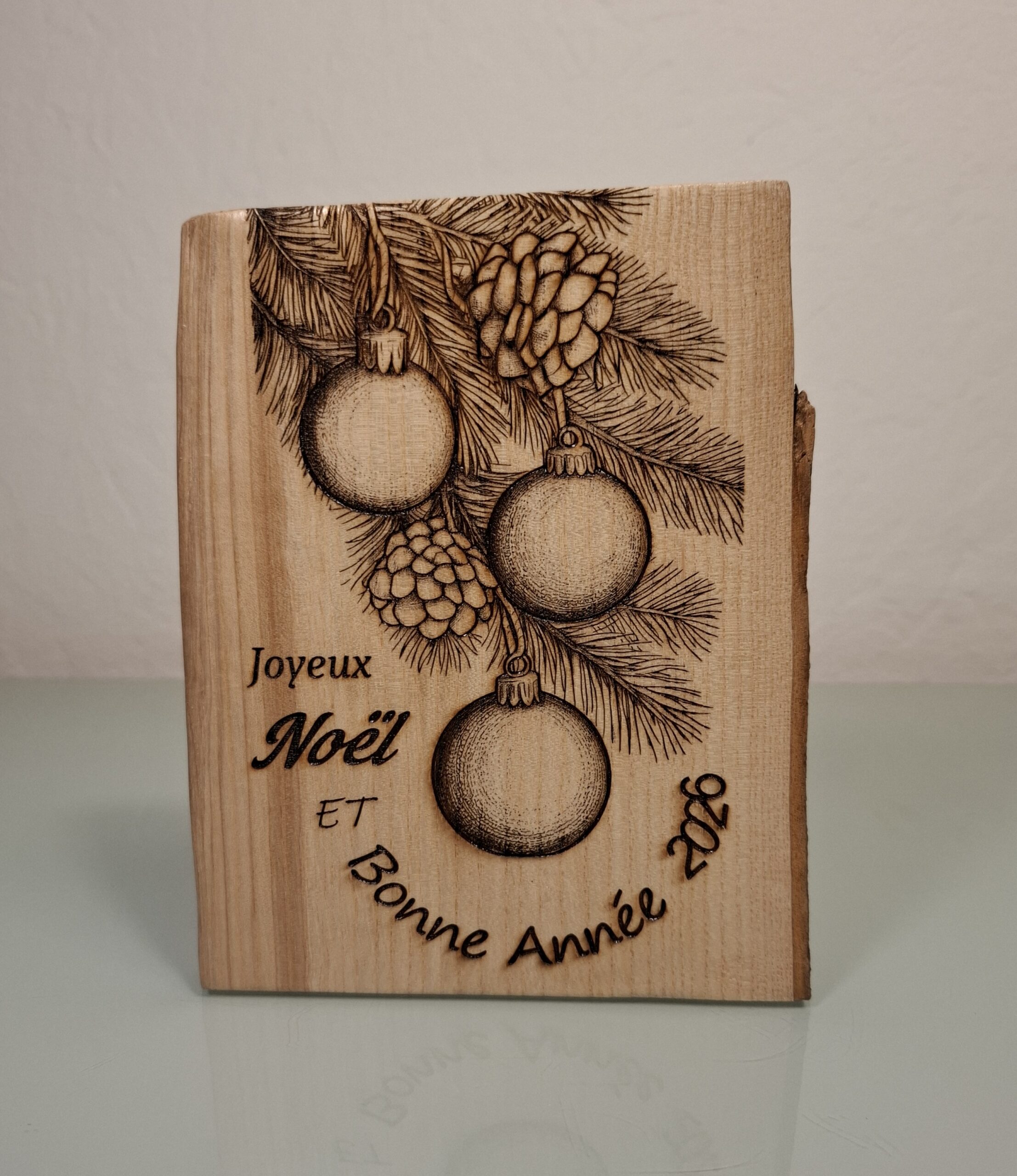 Bonne Année 2026 gravure laser sur un bout de frêne massif. Cette pièce unique capture l’essence magique de Noël et le passage à la nouvelle année. C’est un ajout parfait pour toute décoration de Noël et de Nouvel An.