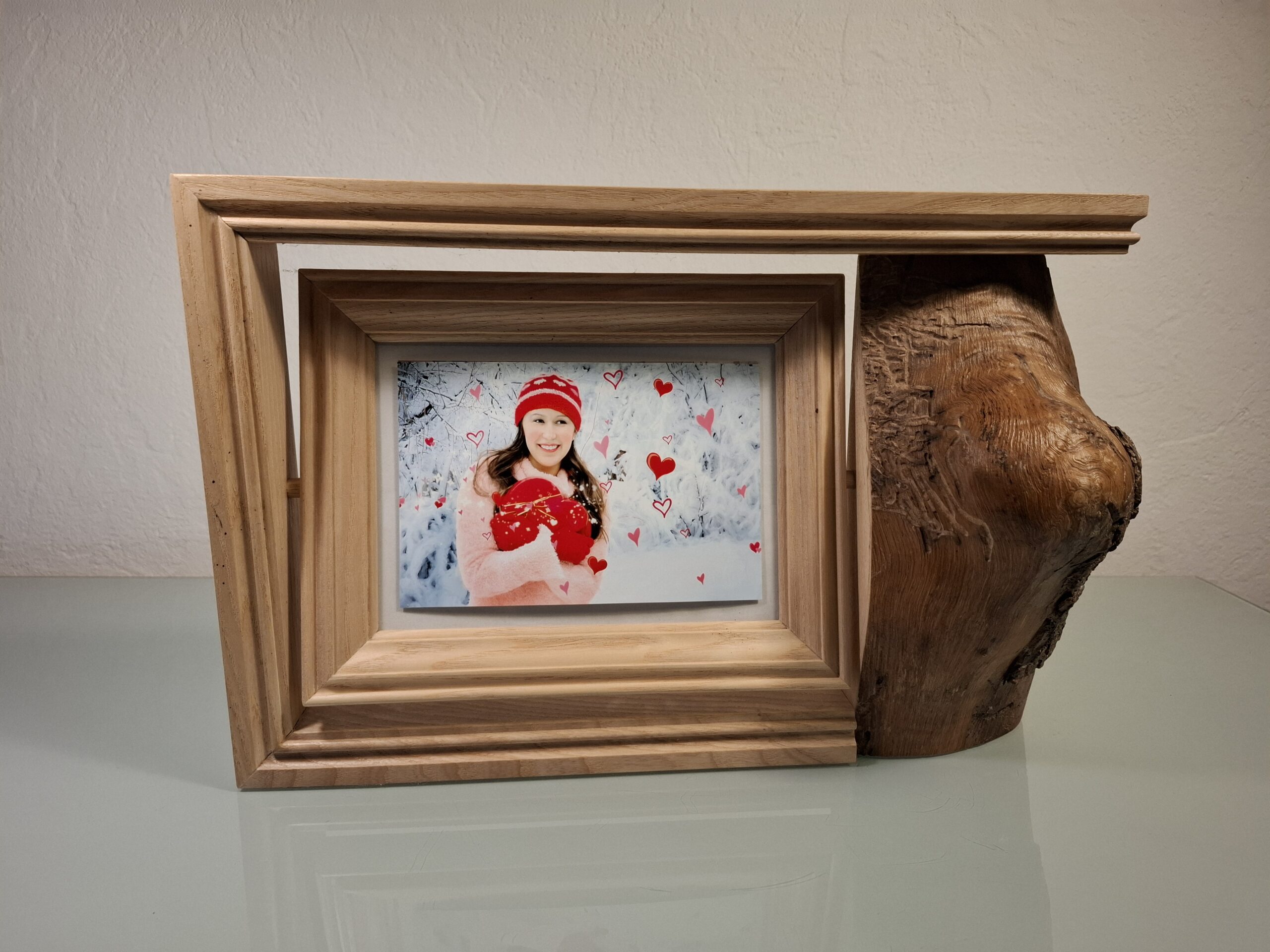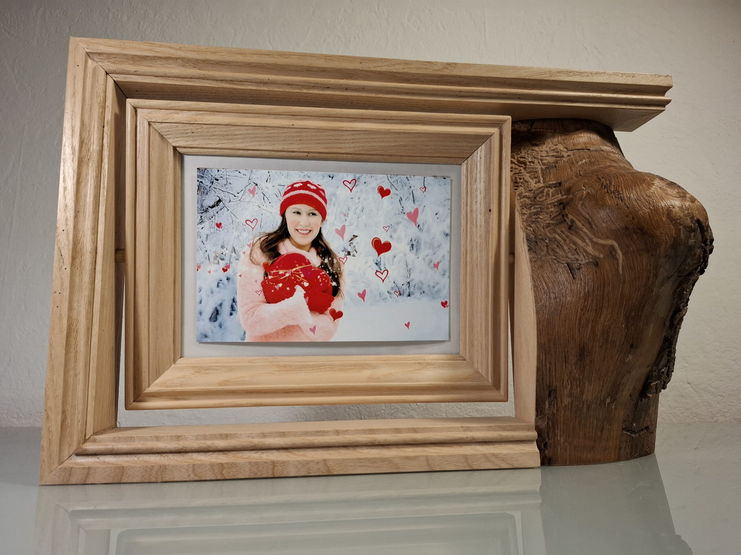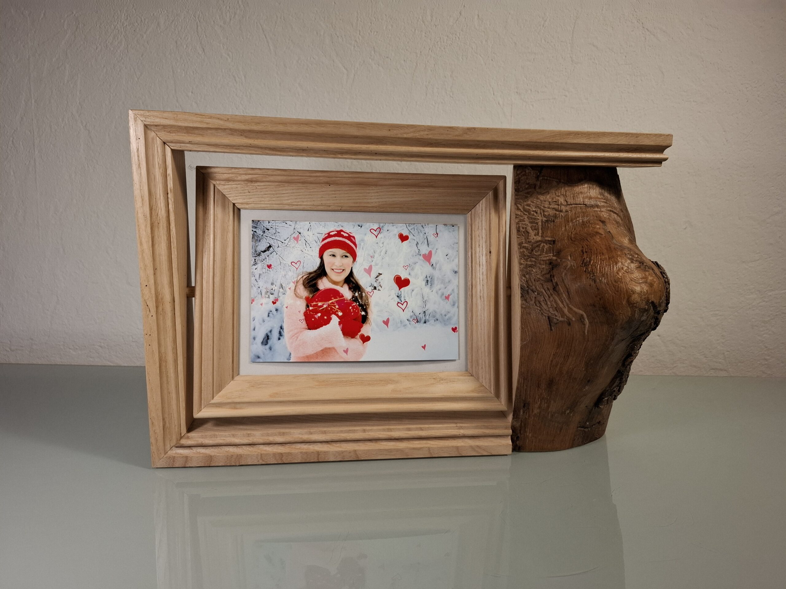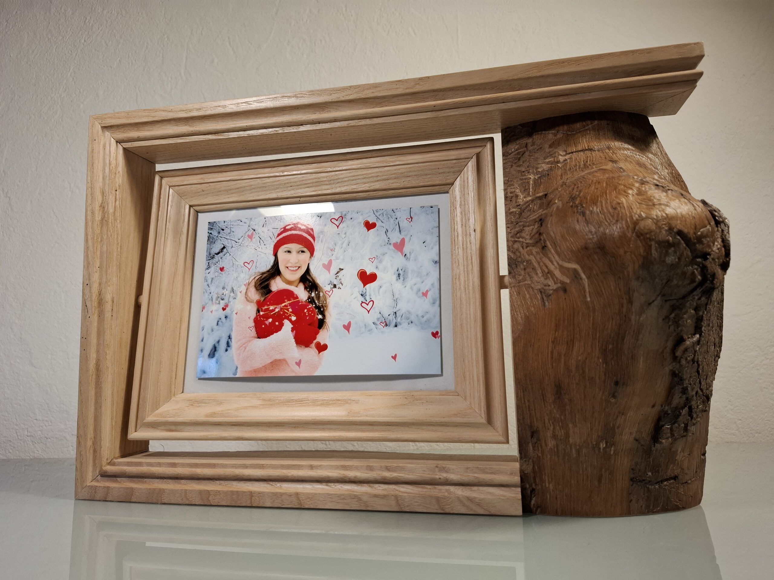 Découvrez le charme intemporel de ce cadre photo à poser en bois. Une véritable œuvre d’art qui sublime vos souvenirs. Ce cadre se distingue par son design campagnard, mêlant tradition et élégance avec ses cadres moulurés d’une autre époque. À droite, un beau morceau de Frêne brut ajoute une touche authentique et rustique.