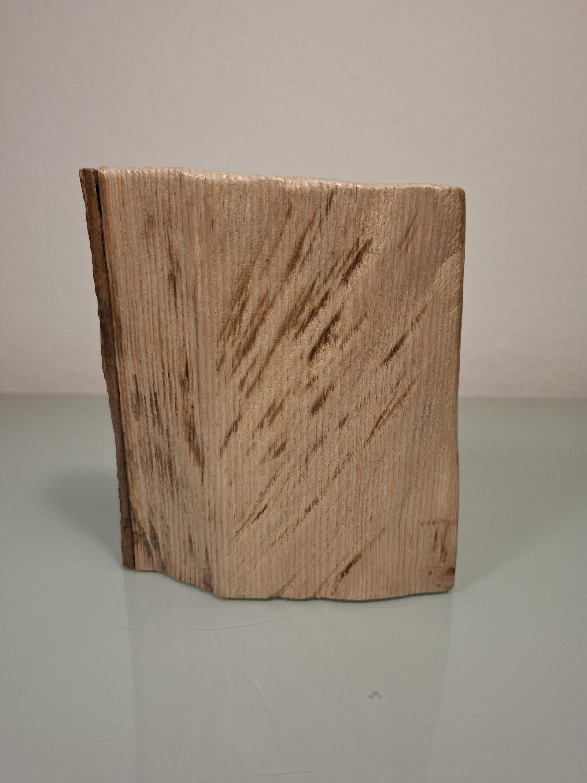 Les bords et la face arrière de la pièce sont laissés bruts, ce qui accentue son charme authentique. Nous avons brossé et poncé chaque surface avec soin pour garantir une finition parfaite. Enfin, trois couches de vernis incolore satiné protègent et subliment le bois.
