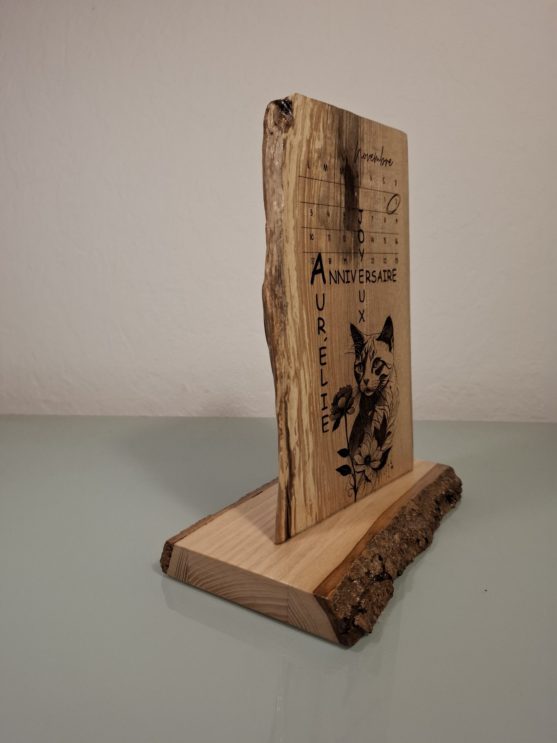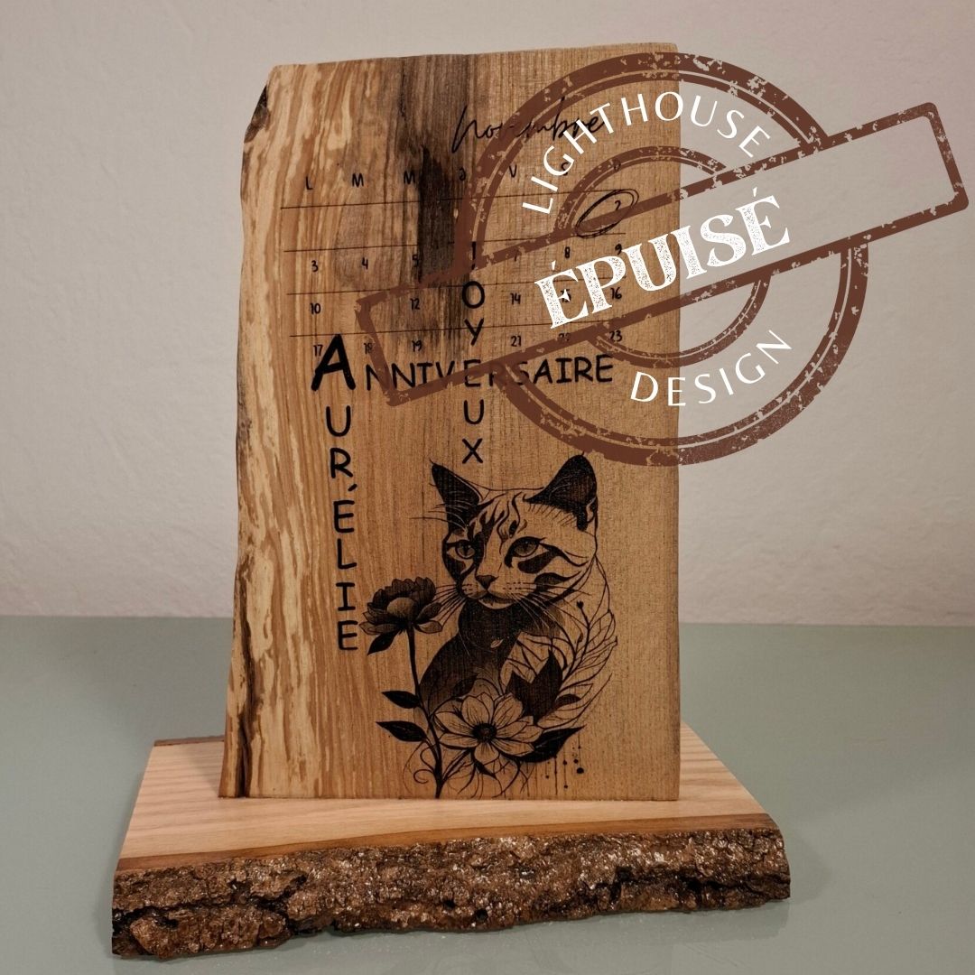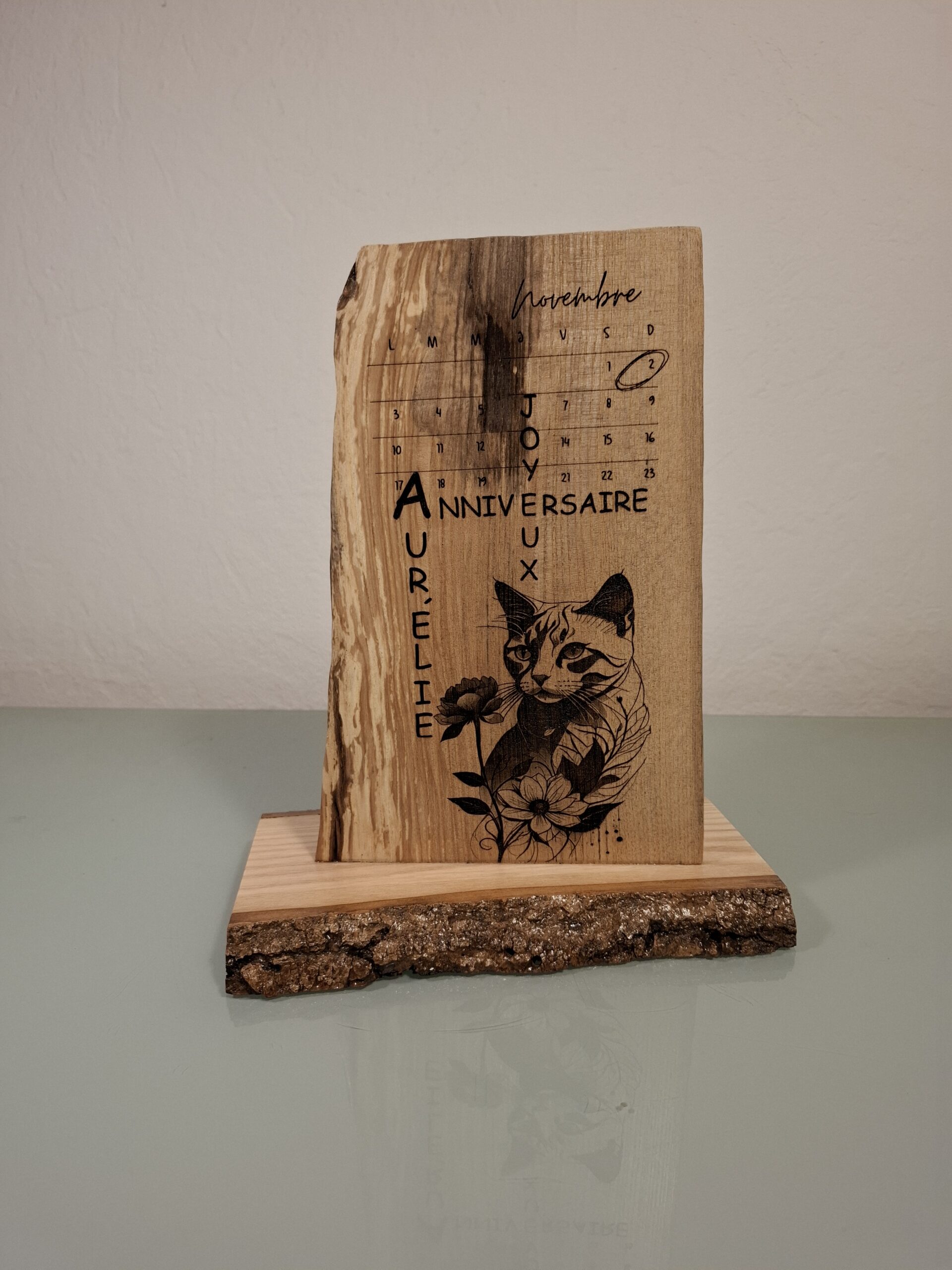Nous avons conçu ce projet avec soin et attention aux détails. À la demande du client, la gravure inclut un calendrier du mois de novembre, où le jour d’anniversaire est délicatement entouré. Pour ajouter une touche personnelle, nous avons intégré une image du chat bien-aimé d’Aurélie. Après validation du design par le client, nous avons réalisé la gravure avec précision sur un Frêne massif.