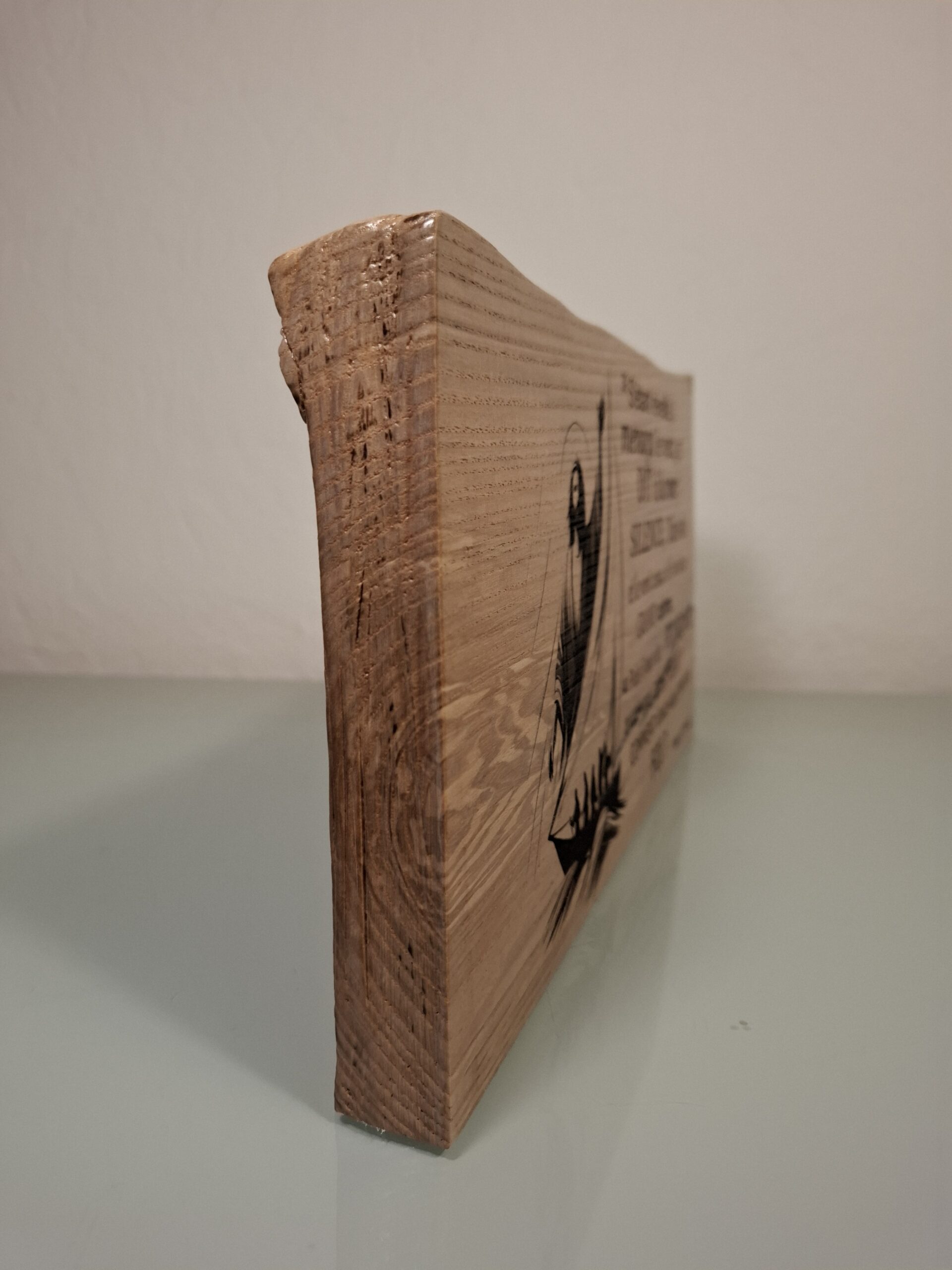 Découvrez une œuvre d’art unique : à savoir cette gravure au laser des versets 39 – 40 dans Marc 4. Cette pièce exceptionnelle transforme un simple bout de bois de Frêne partiellement échauffé en un trésor spirituel. Chaque mot du verset s’imprime avec une précision remarquable, éveillant la réflexion et enrichissant votre foi.