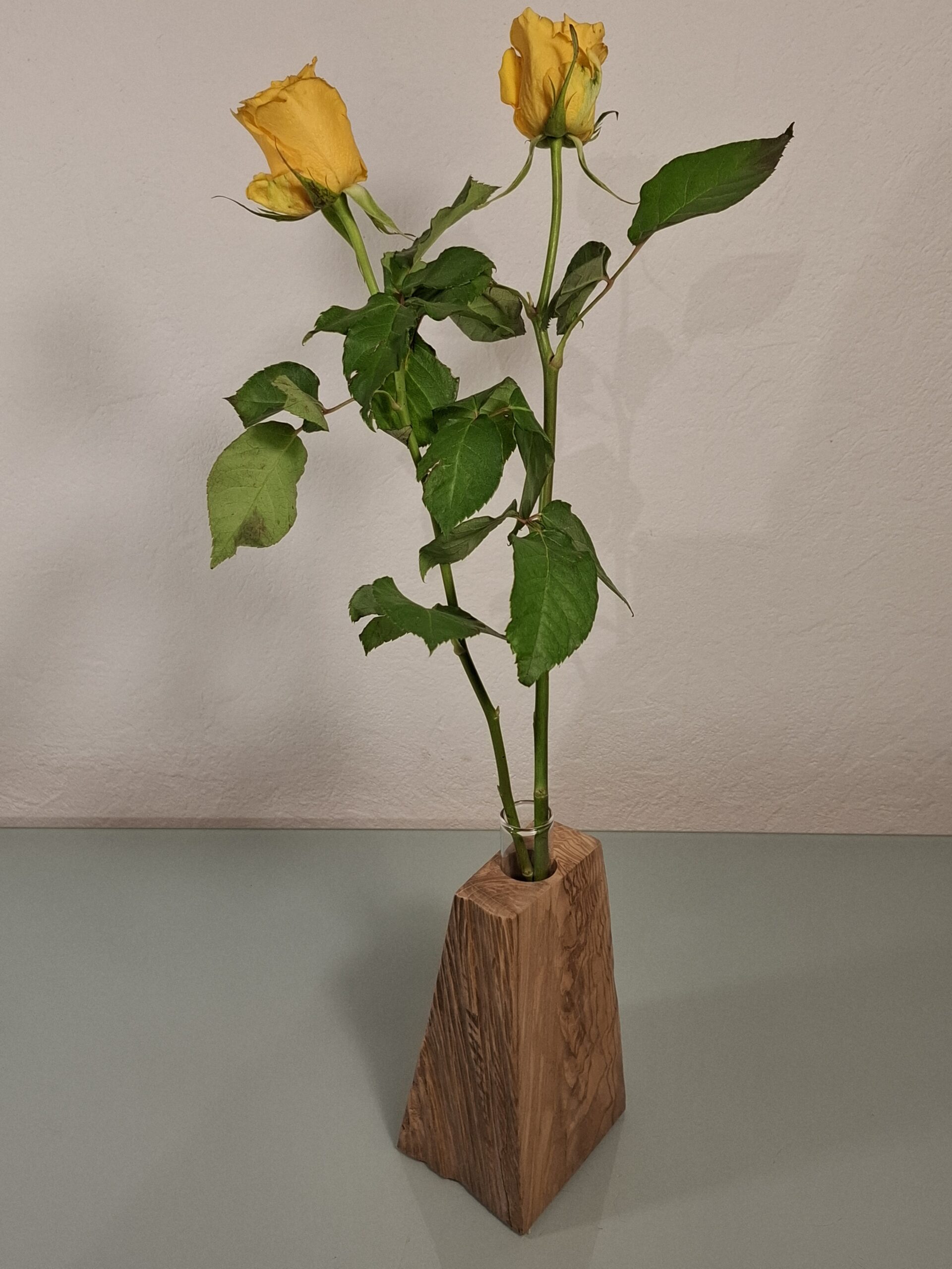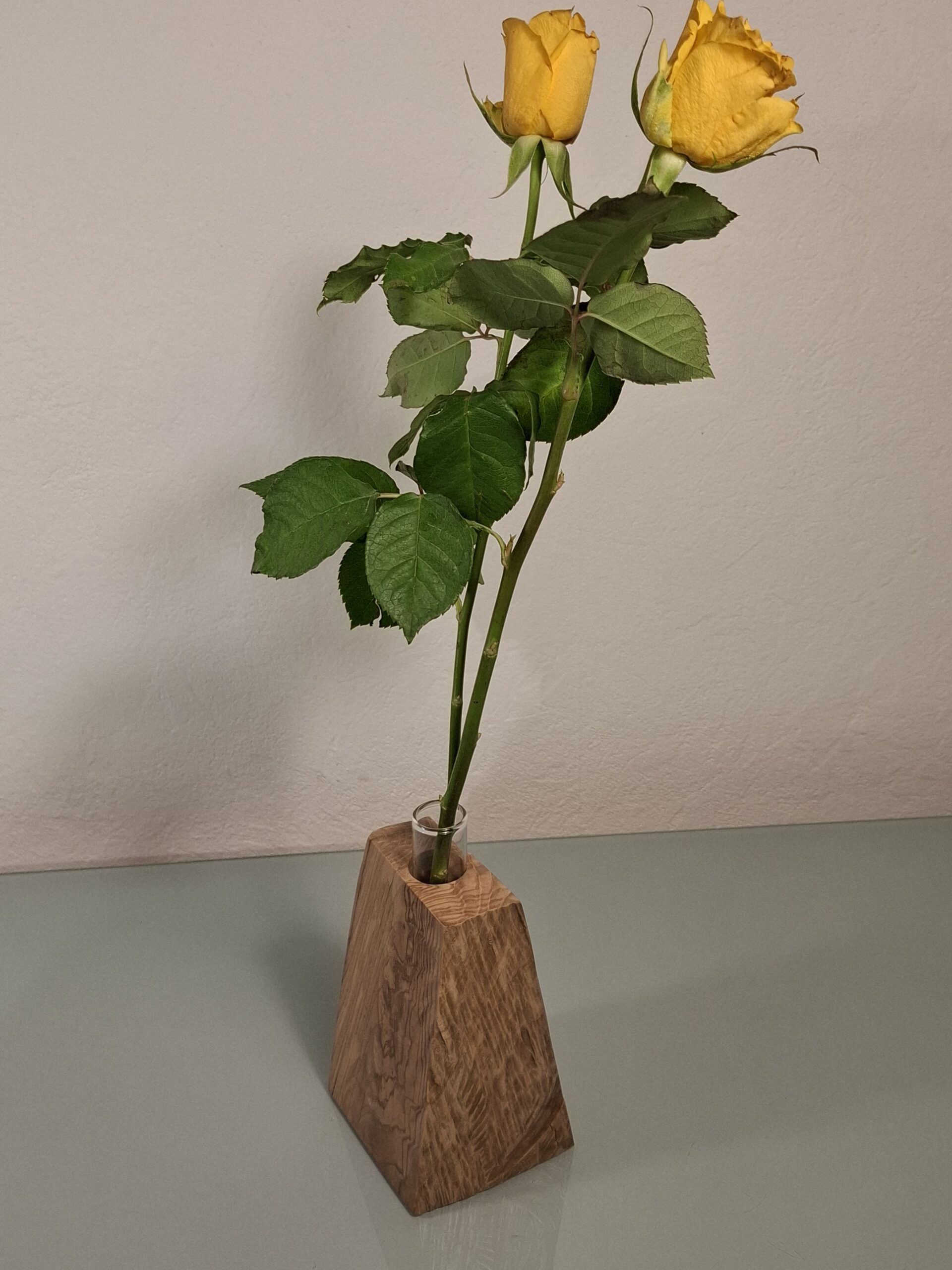 Ce soliflore présente un design authentique grâce à ses deux grandes faces soigneusement rabotées et poncées. Les petites faces conservent leur état brut, avec des marques de tronçonneuse encore visibles. Cet aspect brut et naturel ajoute une touche d’authenticité à l’objet. La couleur brune du bois est entièrement naturelle, ce qui renforce son charme et son élégance.