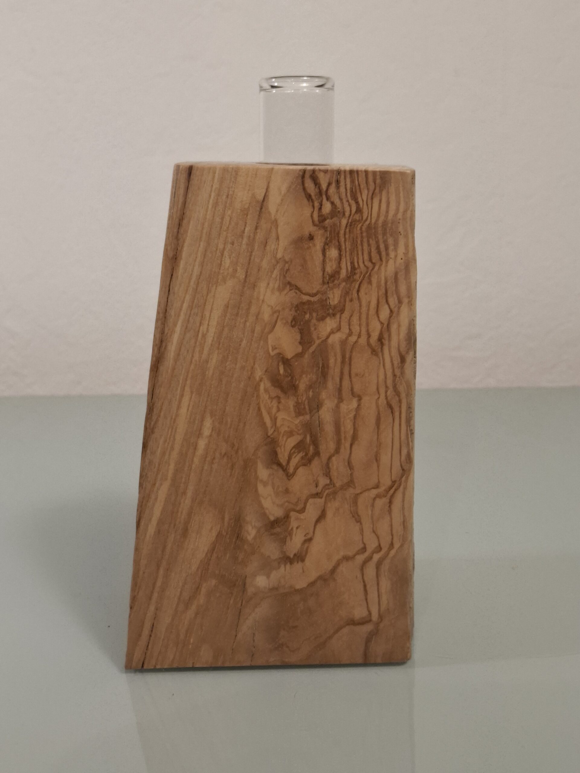Ce soliflore séduit par son design authentique. Deux grandes faces sont soigneusement rabotées et poncées. Les petites faces conservent un état brut, avec des marques de tronçonneuse visibles. Ce contraste entre le brut et le travaillé accentue son authenticité. La couleur brune naturelle du bois lui confère une élégance particulière, sans artifice.