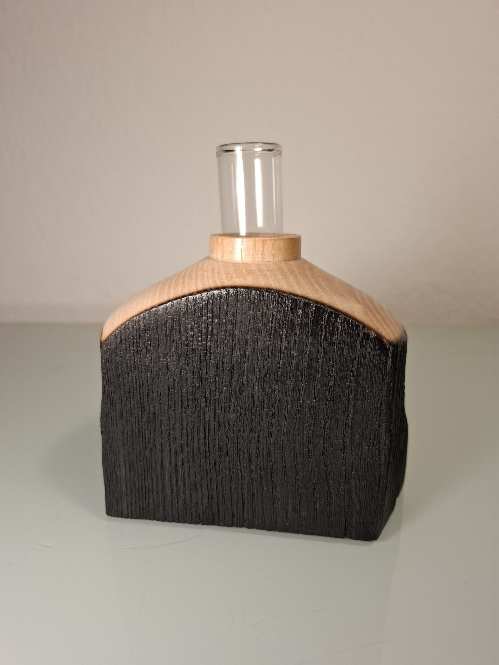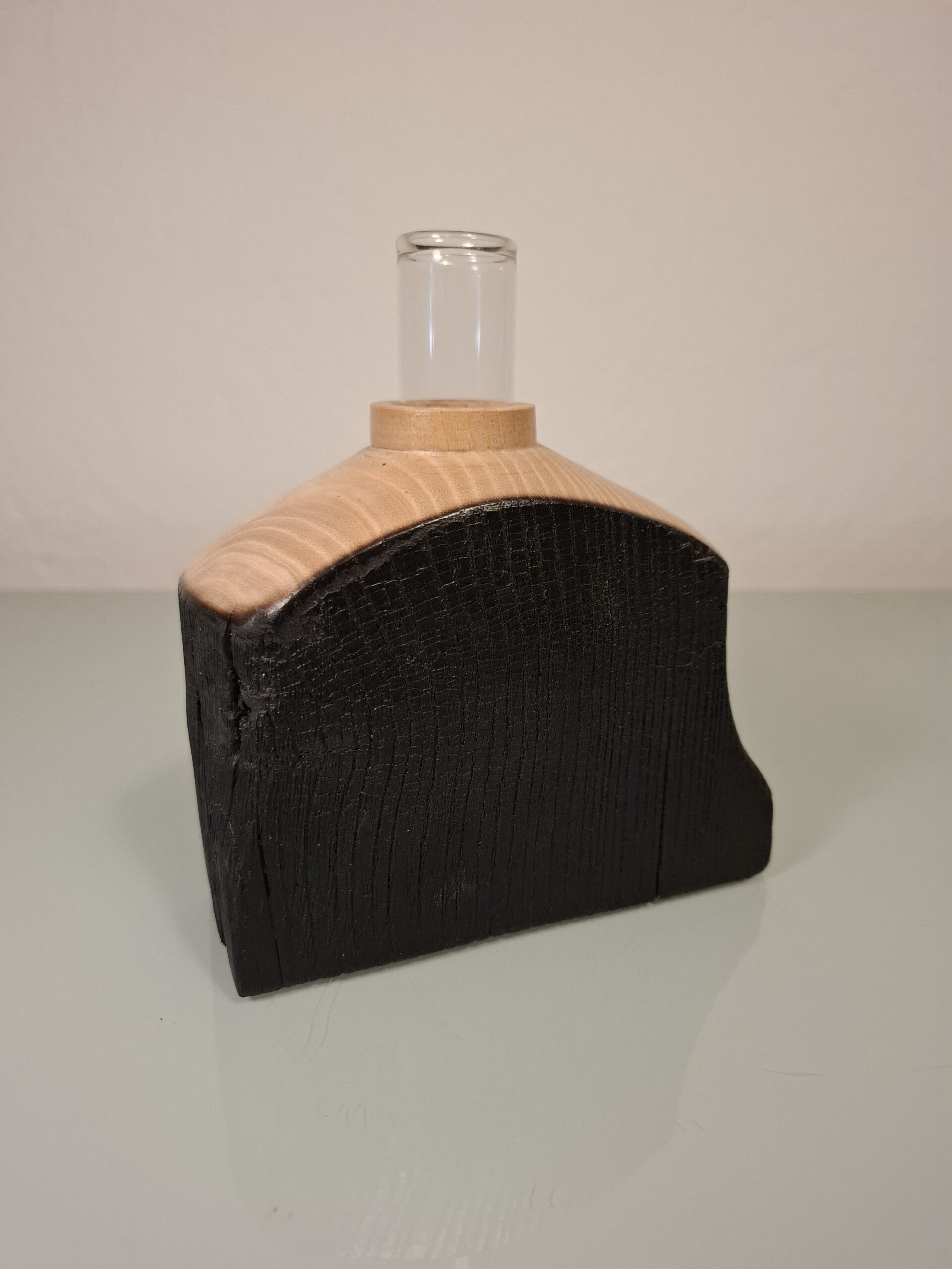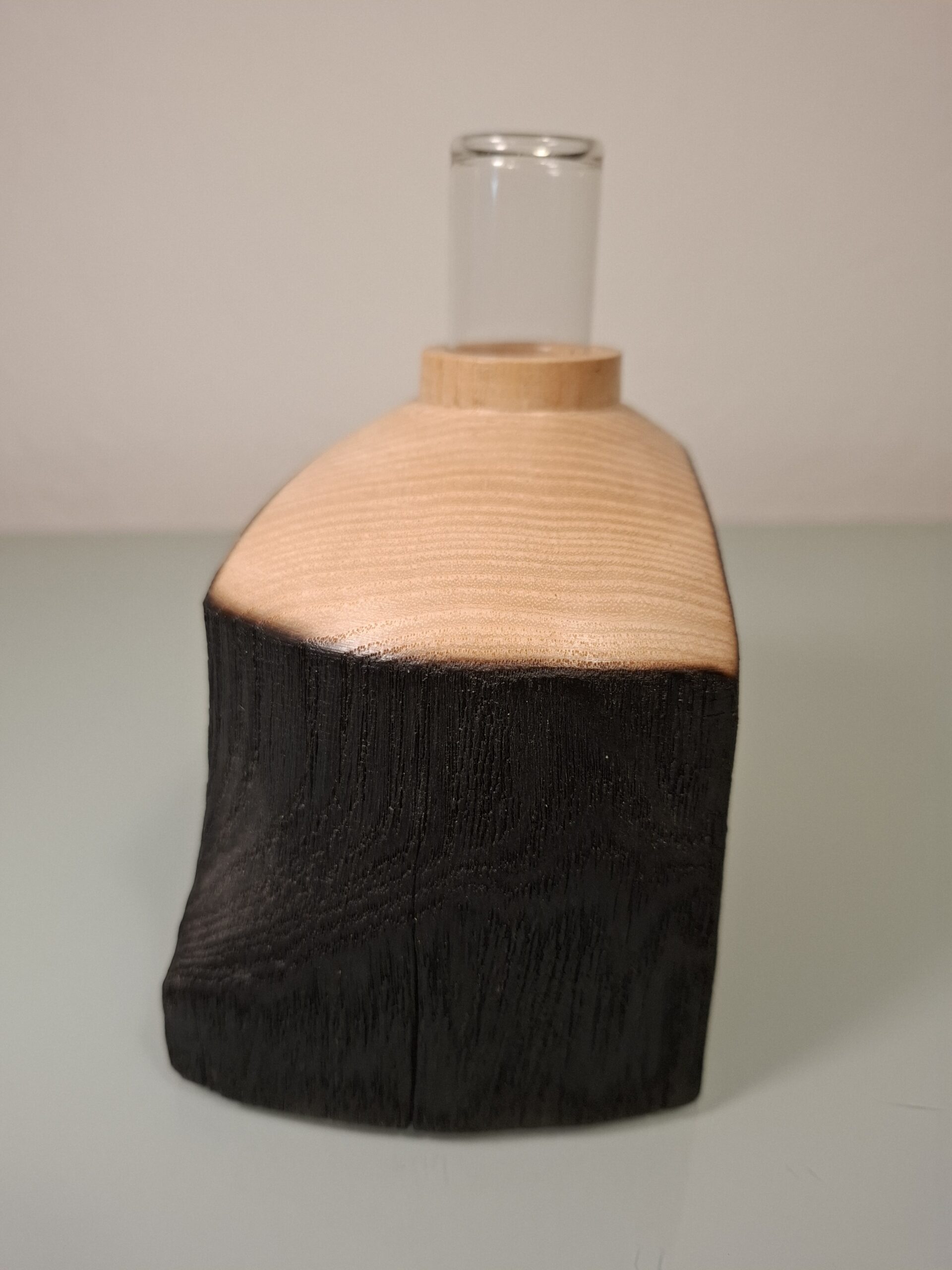 Le traitement à la manière du « Shu Sugi Ban » confère à la partie basse du soliflore une apparence singulière, alliant esthétique moderne et méthodes ancestrales. Le bois brûlé, avec ses teintes sombres et profondes, crée un contraste magnifique avec le reste du vase, mettant en valeur la beauté naturelle du frêne. Cette technique non seulement embellit le bois, mais le protège également contre les éléments, ce qui en fait un choix à la fois esthétique et pratique.