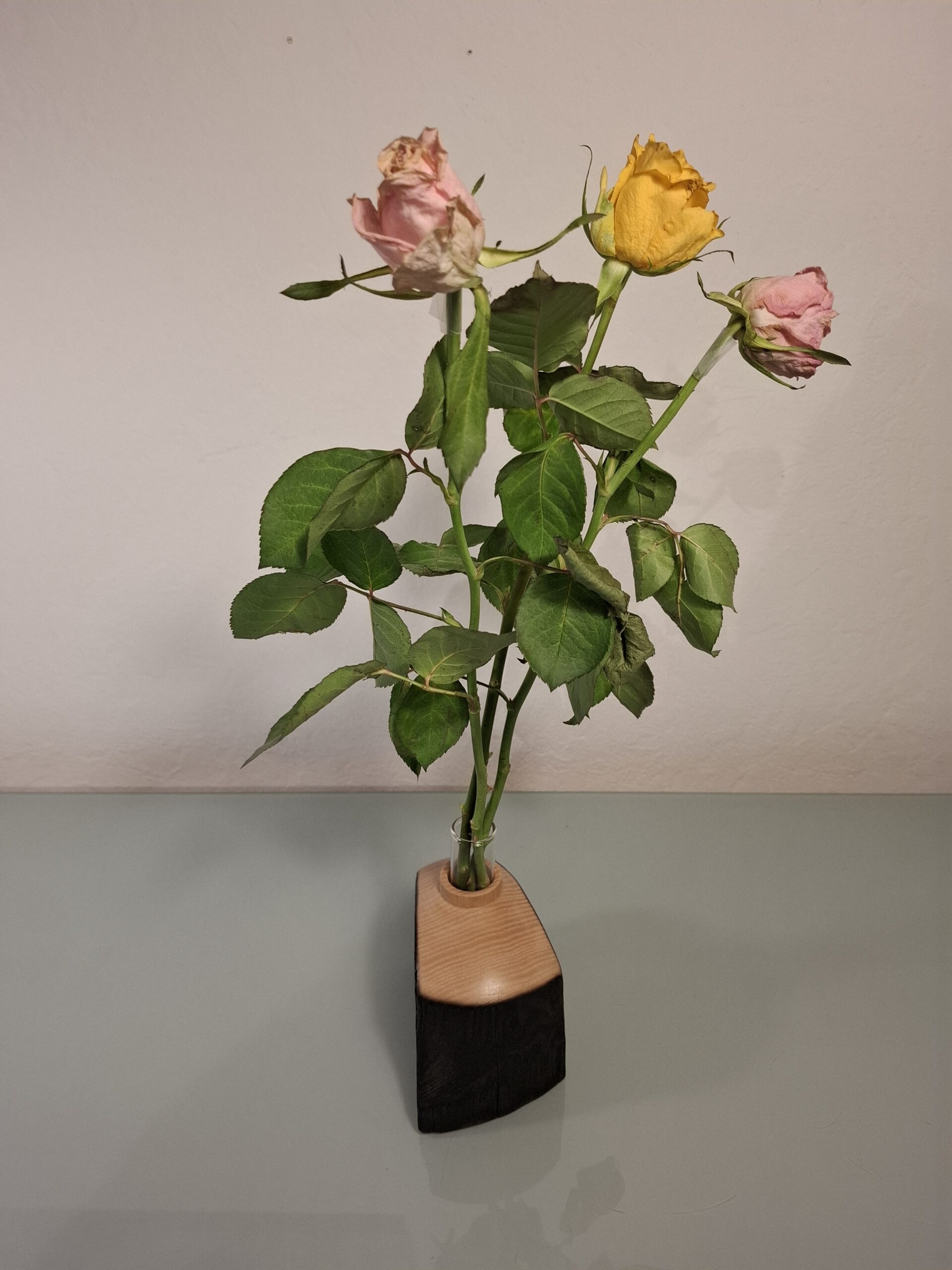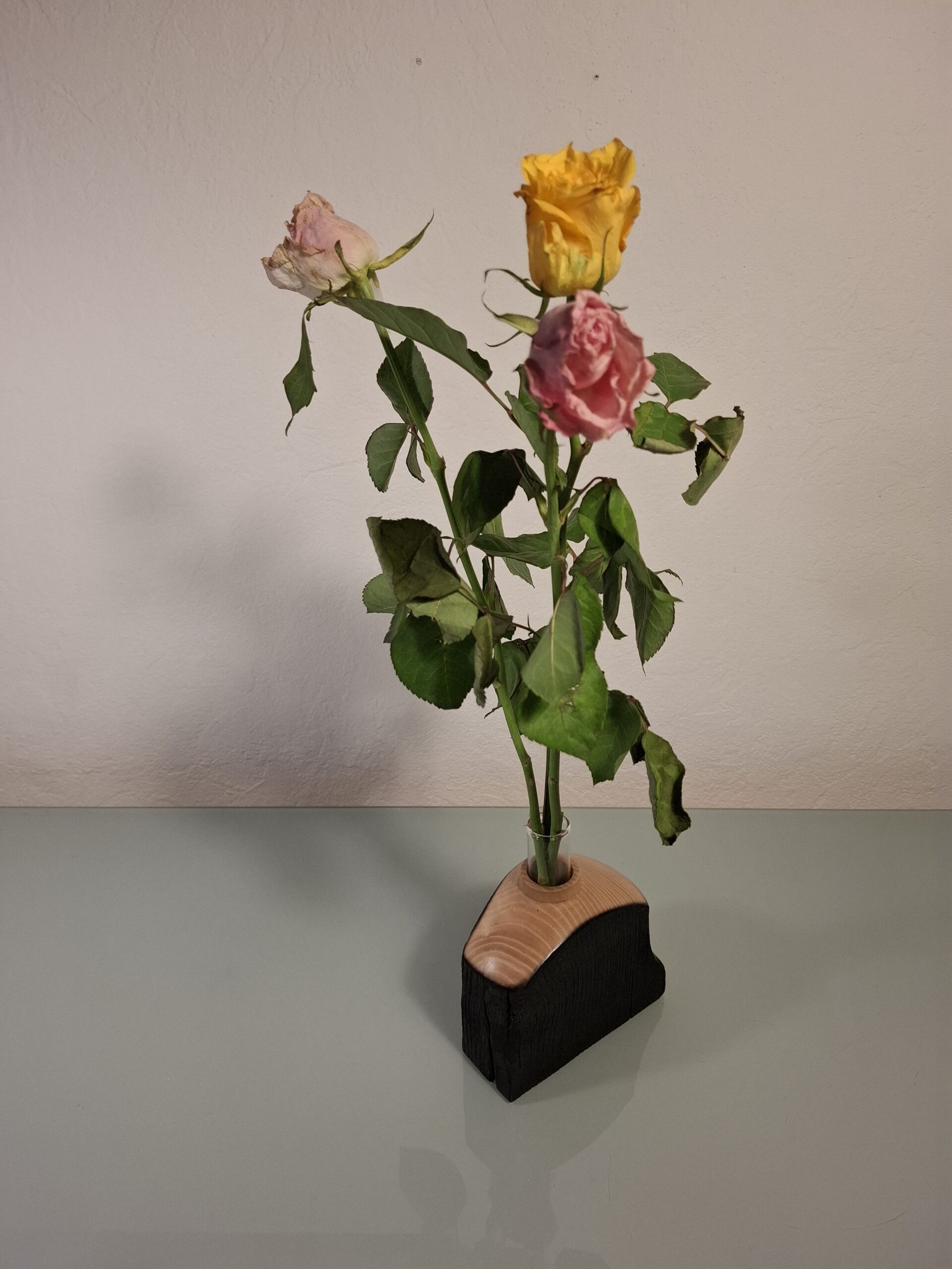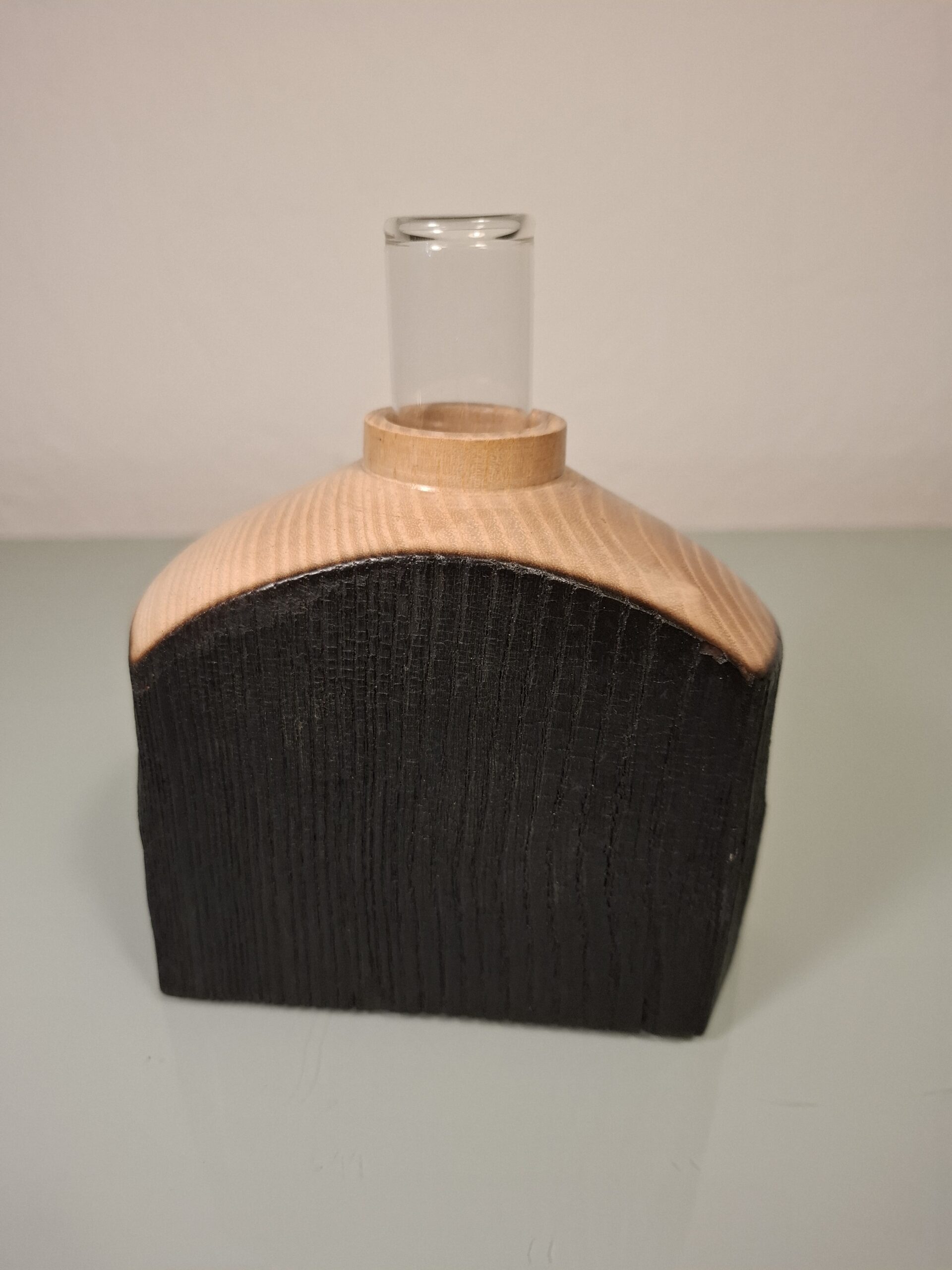 Le traitement à la manière du « Shu Sugi Ban » confère à la partie basse du soliflore une apparence singulière, alliant esthétique moderne et méthodes ancestrales. Le bois brûlé, avec ses teintes sombres et profondes, crée un contraste magnifique avec le reste du vase, mettant en valeur la beauté naturelle du frêne. Cette technique non seulement embellit le bois, mais le protège également contre les éléments, ce qui en fait un choix à la fois esthétique et pratique.