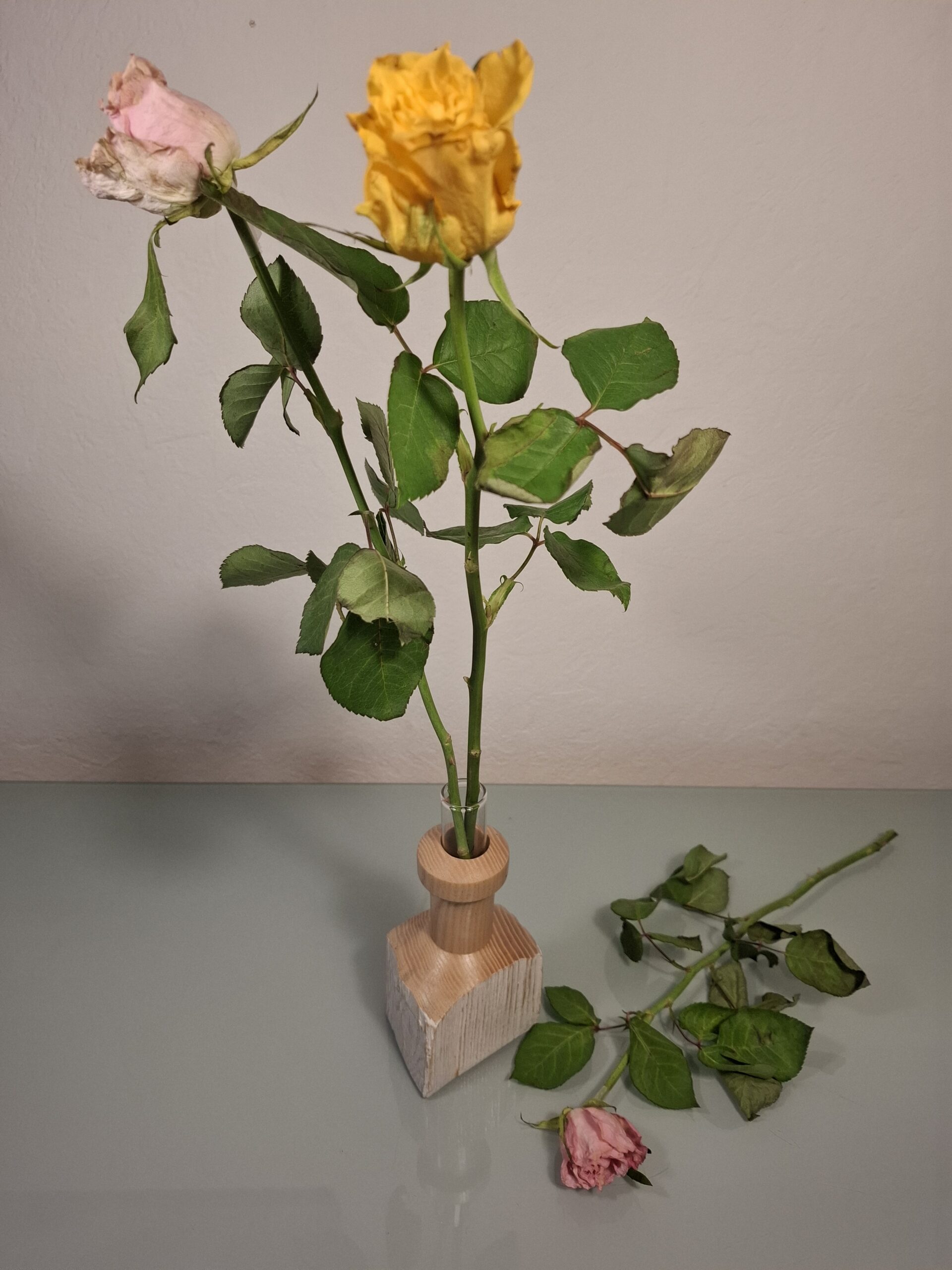 Le soliflore présente est en bois de Frêne, soigneusement tournée pour offrir une esthétique naturelle et chaleureuse. La base brute, poncée avec soin, ajoute une touche rustique tout en garantissant une prise en main agréable. Une peinture blanche à la craie recouvre la partie basse, complétée par deux couches de vernis incolore, assurant protection et élégance.