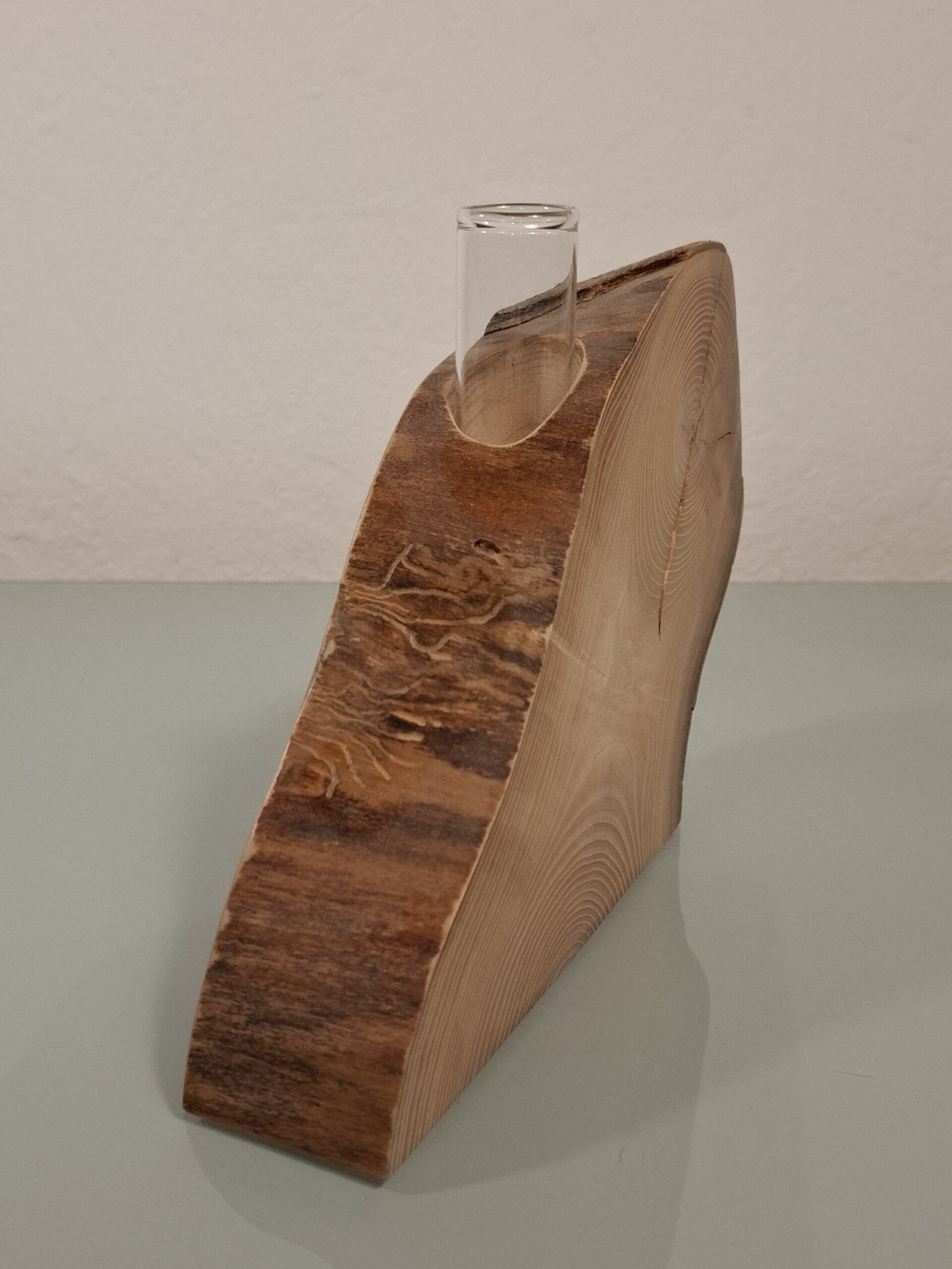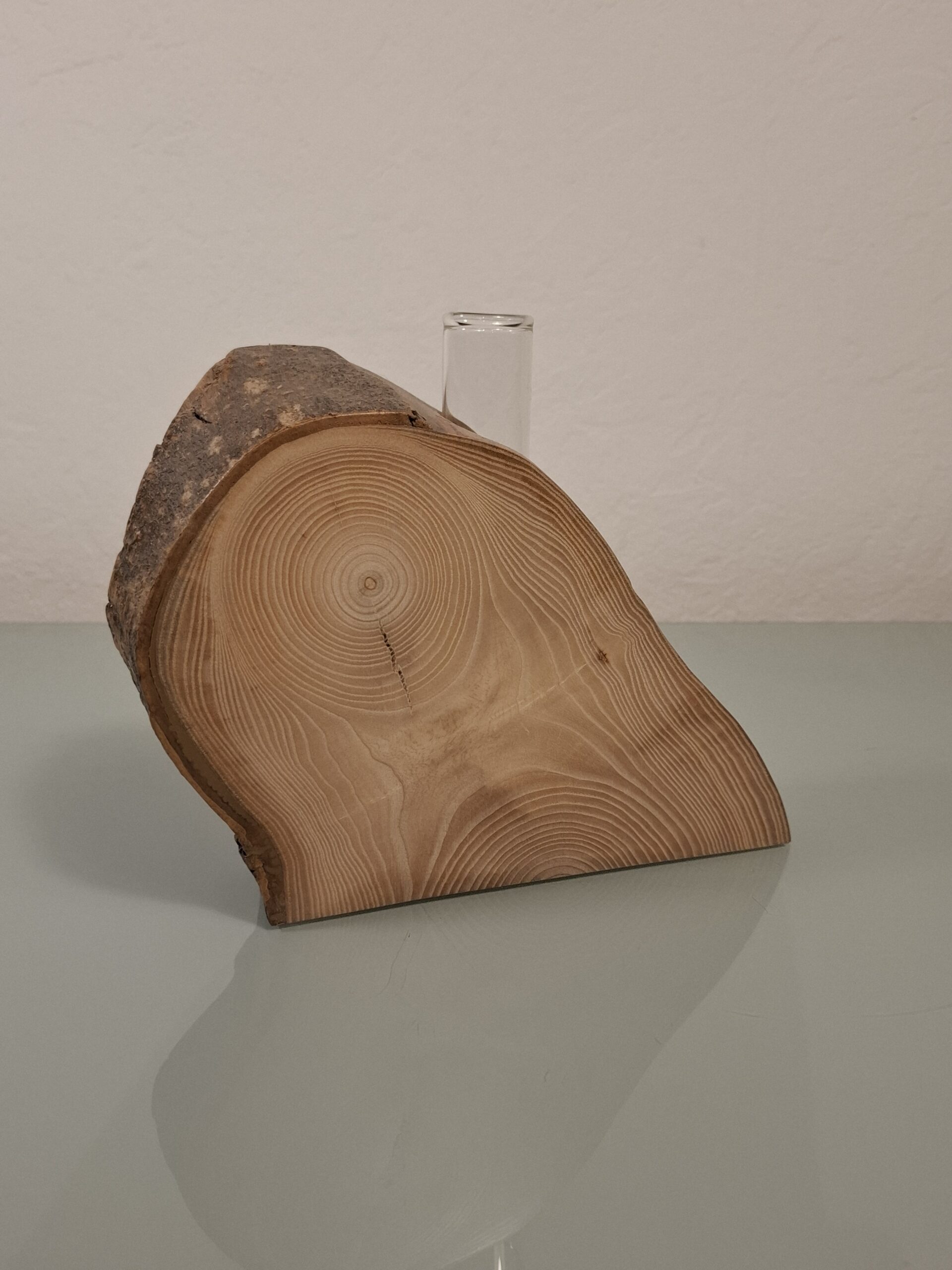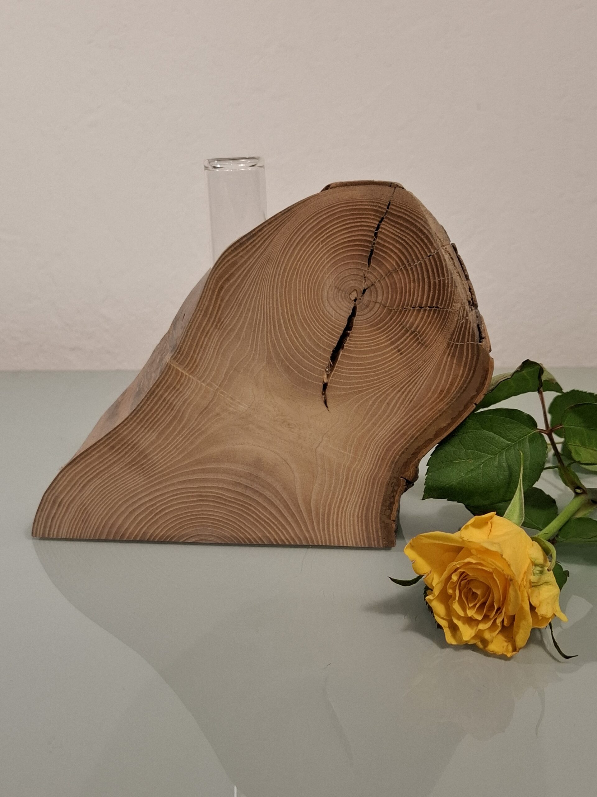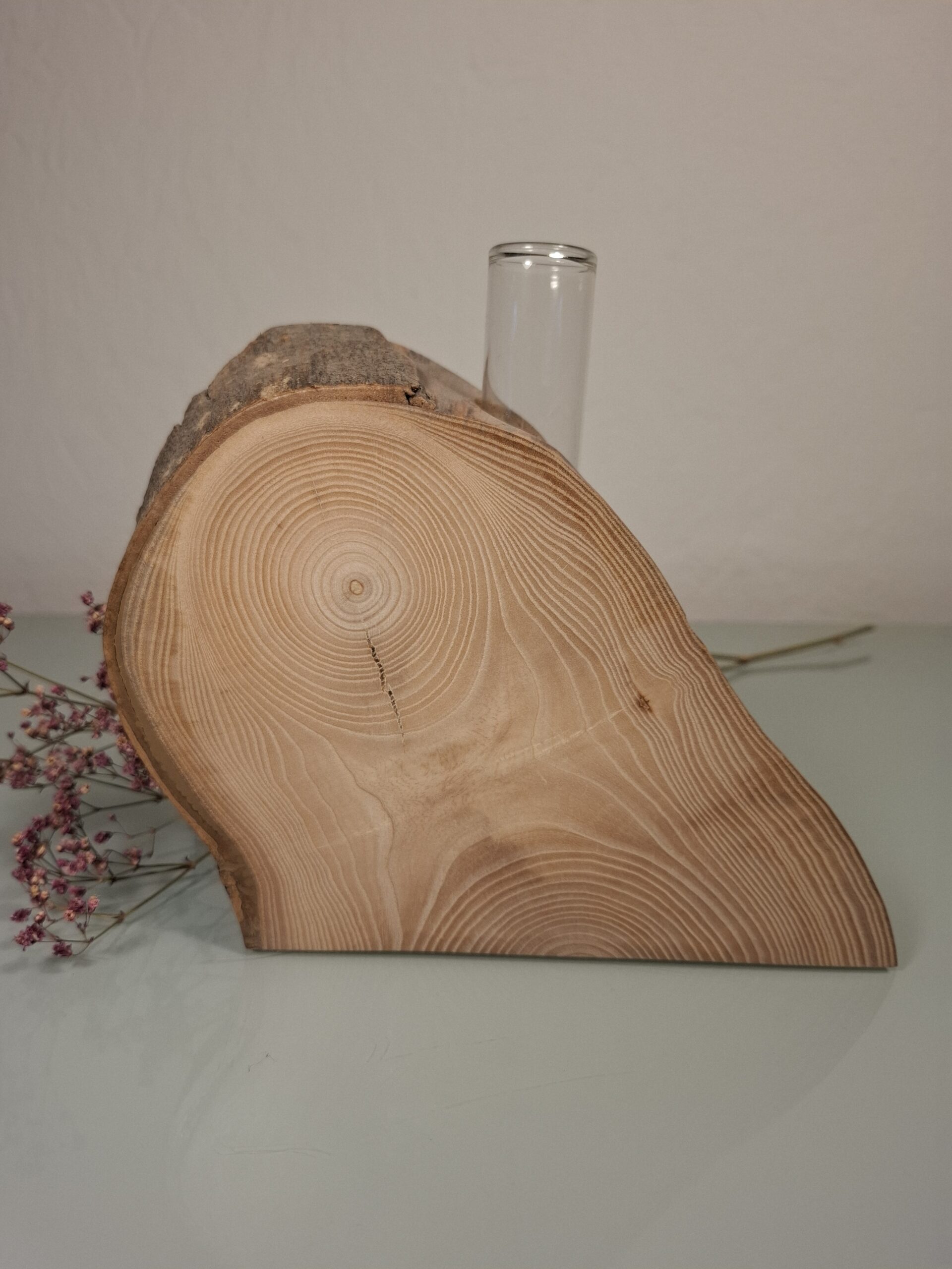 Un soliflore tranche de bois, une véritable oeuvre naturelle. Ce soliflore artisanal est pour celles ceux qui chérissent la déco nature et champêtre. Ce soliflore unique est taillé dans une fourche de bois, méticuleusement poncé pour révéler les cernes annuels du bois. Il constitue une idée cadeau originale et raffinée pour toute occasion spéciale.