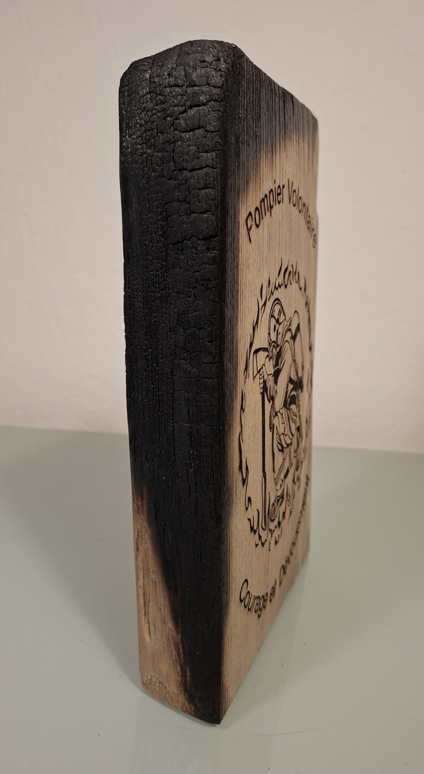 Trophée en bois massif gravé thème pompiers – Une pièce de collection