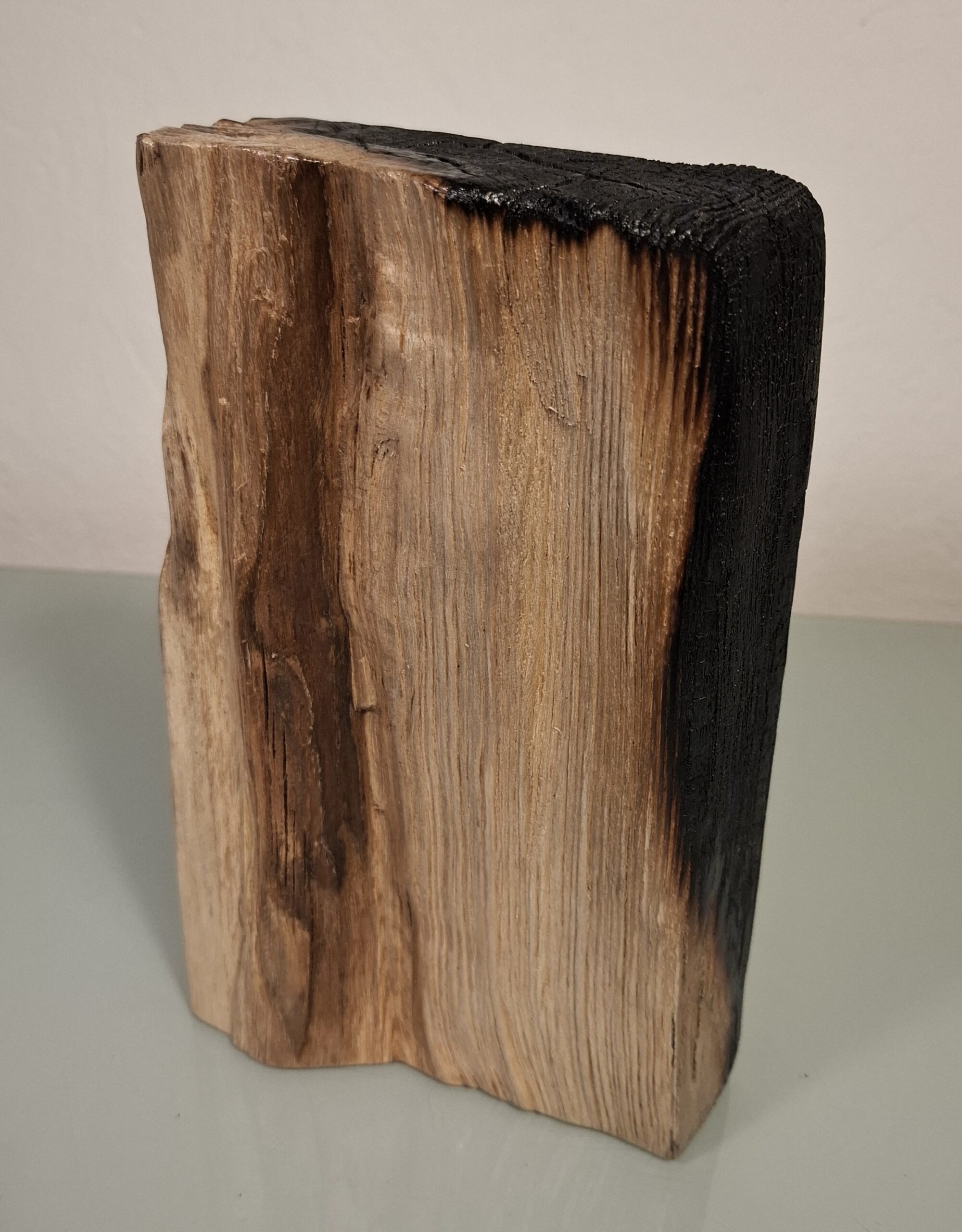 Fabriqué en frêne massif légèrement échauffé. Ce trophée allie la robustesse et l’élégance du bois. Certaines faces conservent un aspect brut. Cependant le véritable contraste visuel vient du fait qu’un côté du trophée à été brûlé. Le bois de frêne, réputé pour sa durabilité, confère à cette œuvre une allure naturelle et authentique.