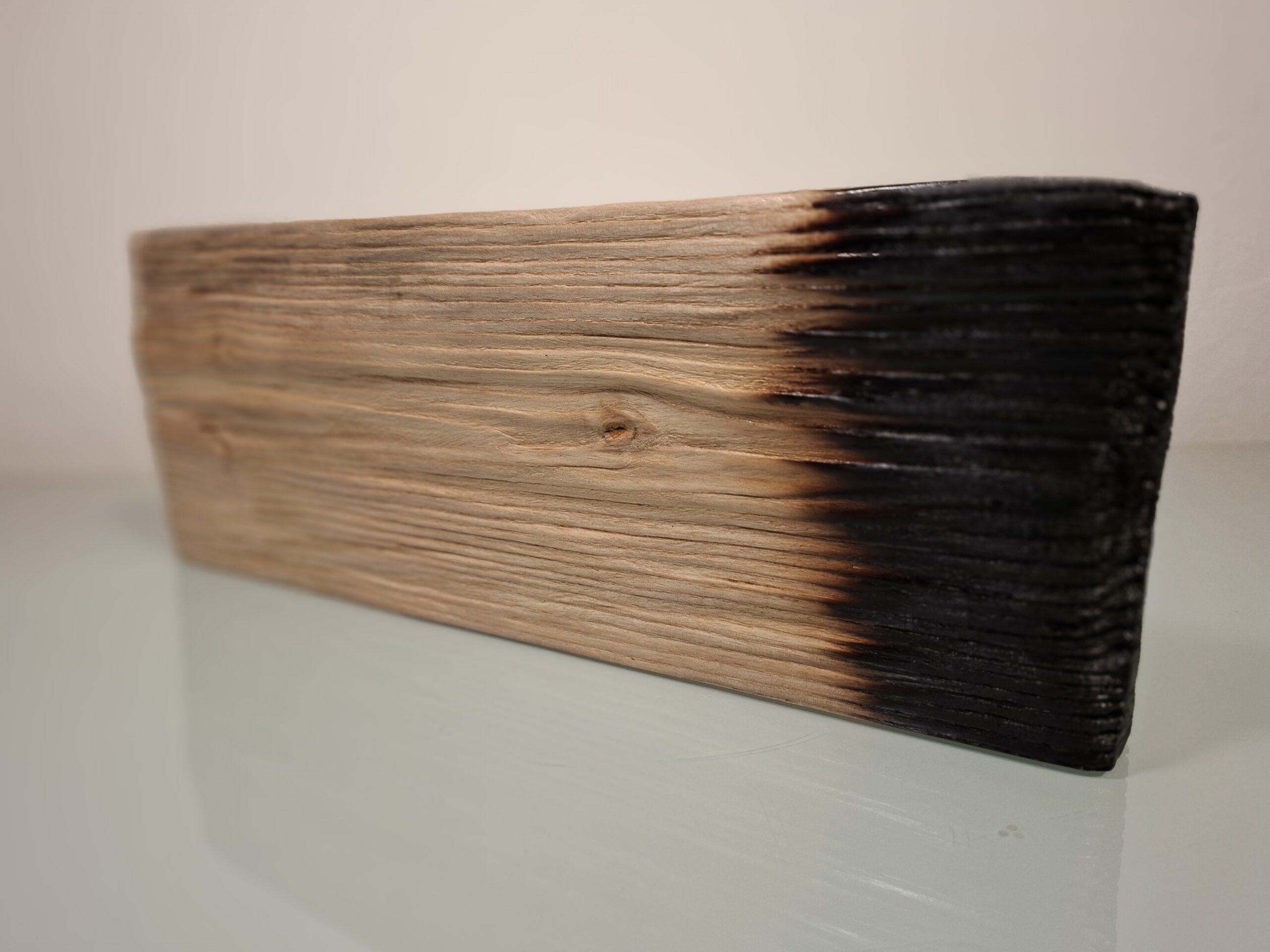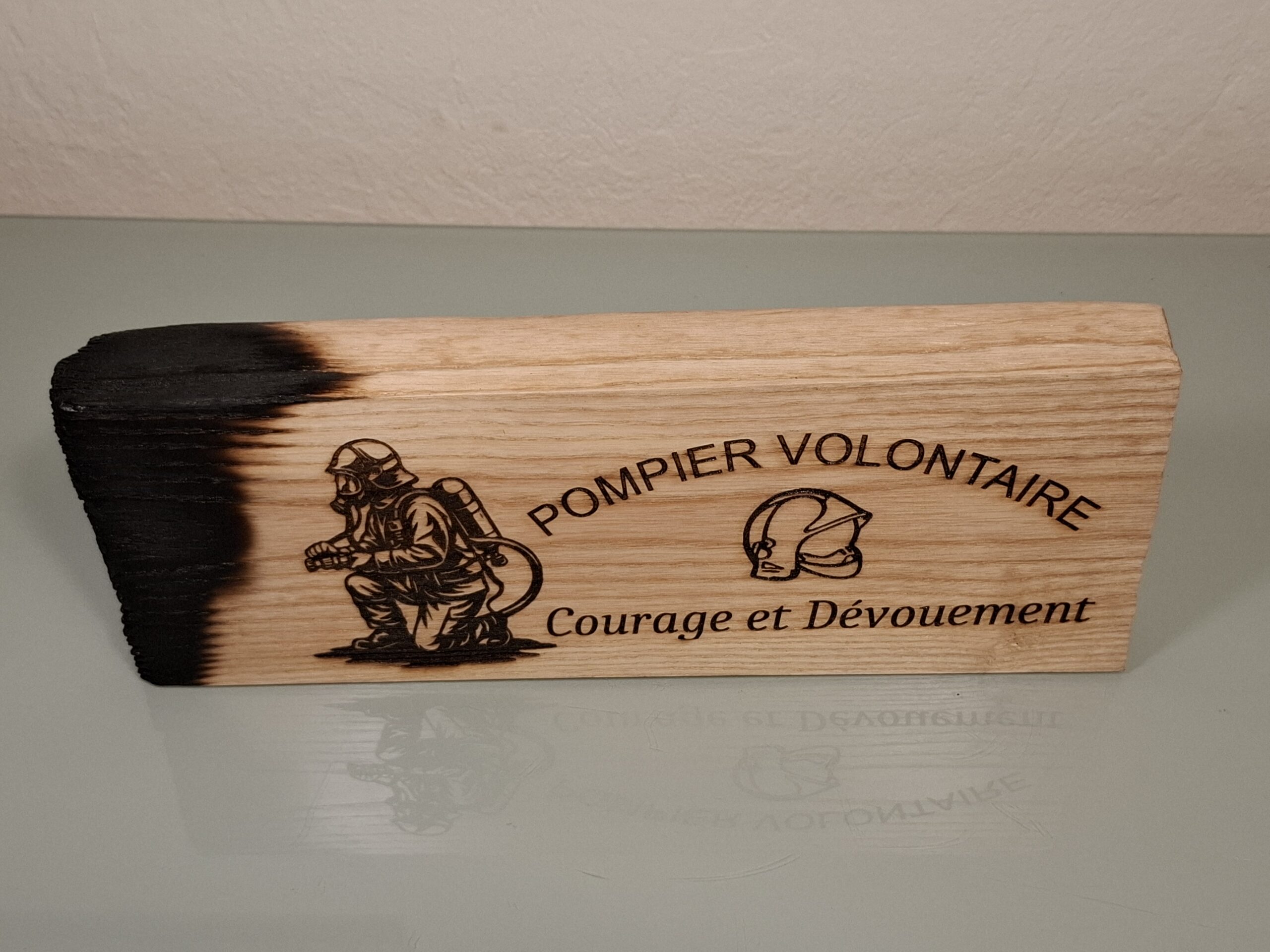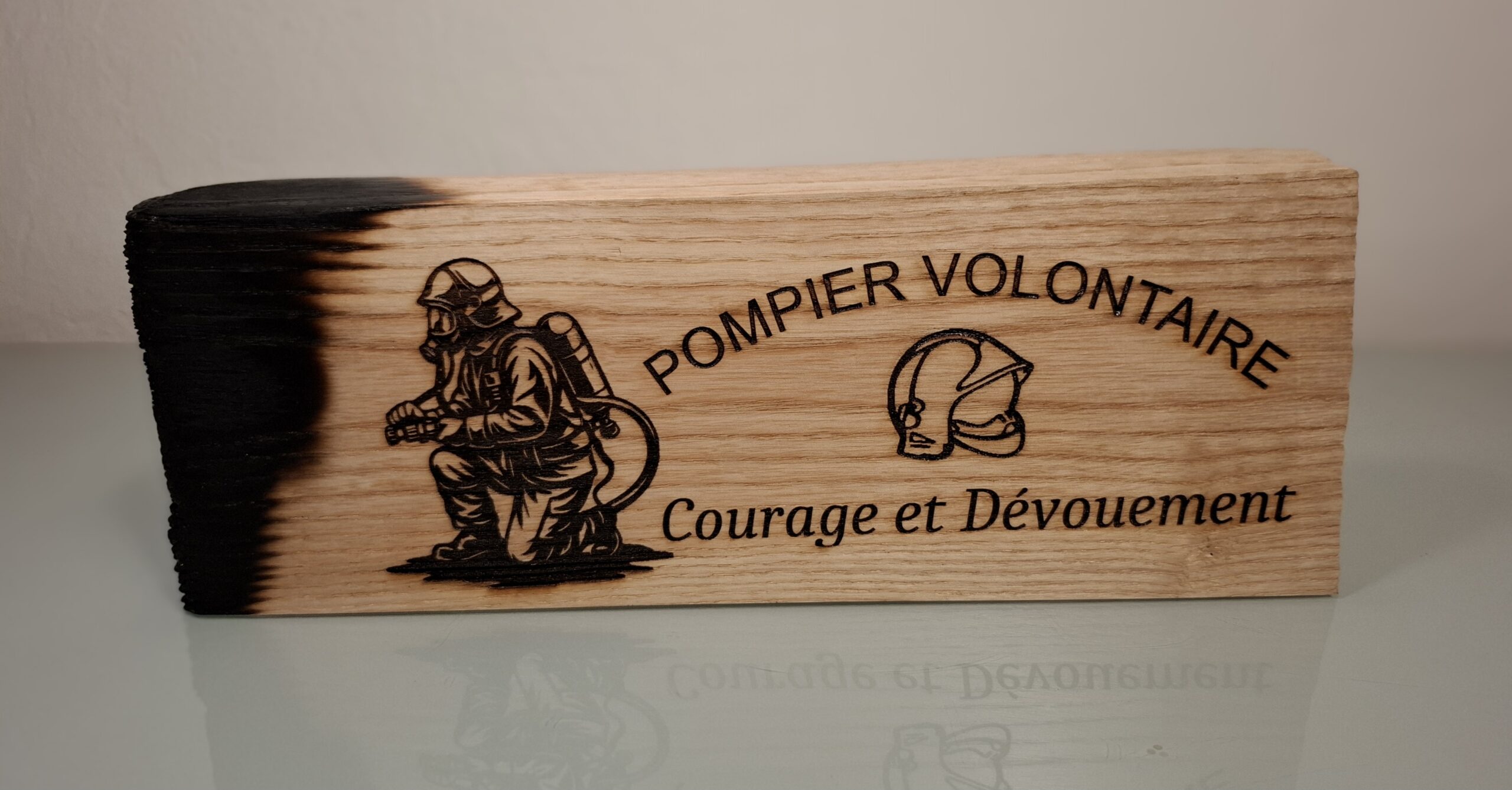 Le design de ce trophée se distingue par son authenticité. Les côtés et la face arrière conservent un aspect brut, avec des traces de tronçonneuse. Cette caractéristique apporte un charme rustique et original à l’objet. Cette œuvre raconte une histoire, un hommage aux pompiers qui sauvent des vies au péril de la leur. Pour marquer encore plus nous avons choisis de brûler un côté du trophée, cela rappelle aussi les interventions périlleuses de soldats du feu.